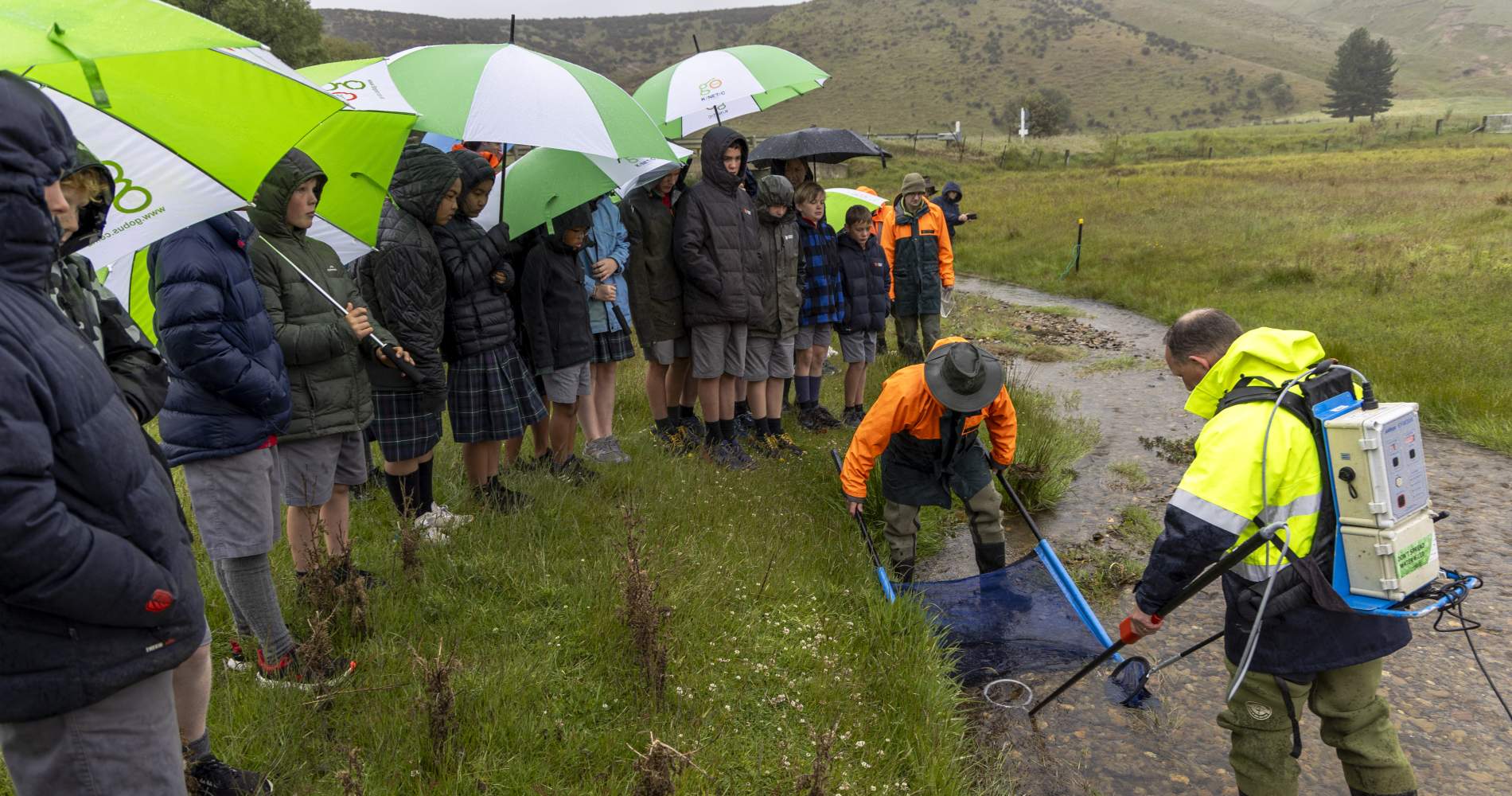 Department of Conservation staff catch galaxiid to show local school children at the Sanctuary opening.